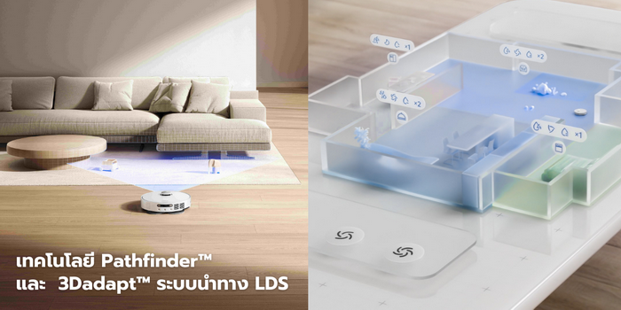 เทคโนโลยี Pathfinder™ และ 3Dadapt™ ระบบนำทาง LDS เพื่อให้สามารถวางแผนเส้นทางการทำความสะอาดได้อย่างชาญฉลาดและหลีกเลียงสิ่งกีดขวางได้อย่างแม่นยำ ในระหว่างการสร้างแผนที่ระบบจะเพิ่มข้อมูลเฟอร์นิเจอร์ผ่านการสแกน AR* ซึ่งช่วยให้แผนที่ 3 มิติมีความถูกต้องยิ่งขึ้นและเส้นทางการเคลือนที่มีความแม่นยำยิงขึ้น