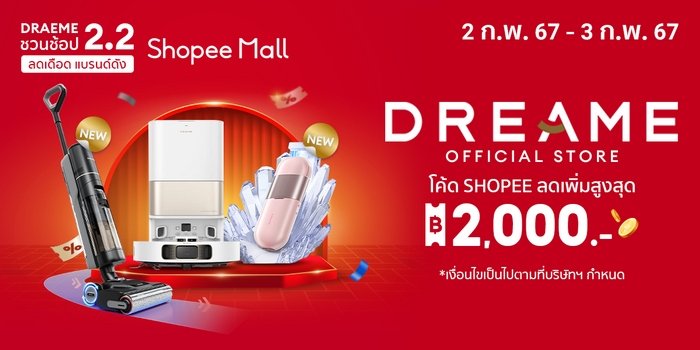 Dreame Thailand มอบข้อเสนอสุดพิเศษ กับการเปิดตัวโปรดักส์ร่วมกับ Shopee 2.2 ลดเดือดแบรนด์ดัง ลูกค้าสามารถซื้อเครื่องใช้ไฟฟ้า Dreame และเก็บโค้ดส่วนลดบน Dreame Official Store บน Shopee Mall ในระหว่างวันที่ 2 – 3 กุมภาพันธ์ 2567 โค้ดพิเศษ ถูกสุดเที่ยงคืน - ตีสอง ใช้ได้แค่ 2 ชม. เท่านั้น! ซึ่งสามารถเก็บโค้ดได้ตั้งแต่วันที่ 30 มกราคม - 1 กุมภาพันธ์ 2567 และใช้ได้ในวันที่ 2 - 3 กุมภาพันธ์ 2567 เท่านั้น โดยมีเงื่อนไขเป็นไปตามที่บริษัทกำหนด