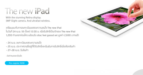 ลูกค้าสามารถซื้อ new iPad ได้ที่สำนักงานบริการลูกค้าดีแทค และดีแทคเซ็นเตอร์ที่ร่วมรายการทั่วประเทศได้ตั้งแต่วันศุกร์ที่ 27 เมษายน 2555 ตรวจสอบรายละเอียดเกี่ยวกับราคาและสถานที่วางจำหน่ายได้ที่เว็บไซต์ www.dtac.co.th/thenewipad