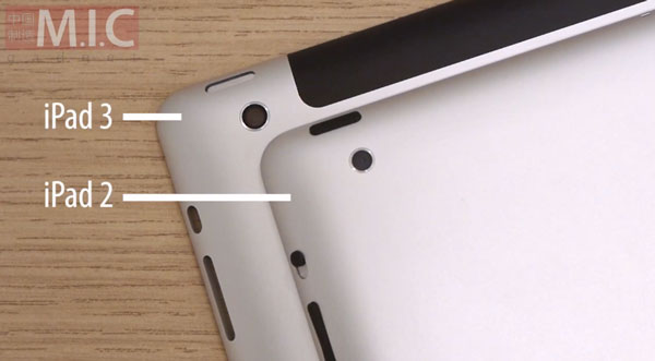 ภาพนี้ เห็นได้อย่างชัดเจนเลยว่า กล้องด้านหลังบน ไอแพด 3 (iPad 3) มีขนาดใหญ่กว่าบน ไอแพด 2 (iPad 2) แต่ยังไม่มีข้อมูลระบุว่า ความละเอียดของกล้องบน ไอแพด 3 (iPad 3) จะมากกว่าด้วยหรือไม่