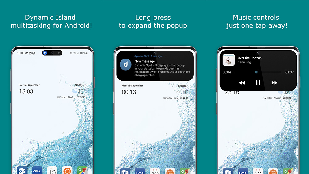 โดยจากภาพตัวอย่าง จะเห็นว่า dynamicSpot นั้น มีฟีเจอร์การทำงานที่ใกล้เคียงกับ Dynamic Island เลยก็ว่าได้ ไม่ว่าจะเป็น การควบคุมเพลง, การแจ้งเตือน, สถานะแบตเตอรี่ นอกจากนี้ ยังชูจุดเด่นอีกด้วยว่า จะมีฟีเจอร์อื่นที่ Apple ไม่มีเพิ่มเข้ามาอีกด้วย เช่น สามารถเข้าถึงการแจ้งเตือนล่าสุดด้วยการแตะที่ Pop-Up หรือกด Pop-Up ค้างไว้เพื่อดูรายละเอียดเพิ่มเติม หรือเลือกช่วงเวลาในการซ่อน-แสดง Pop-Up เหล่านี้