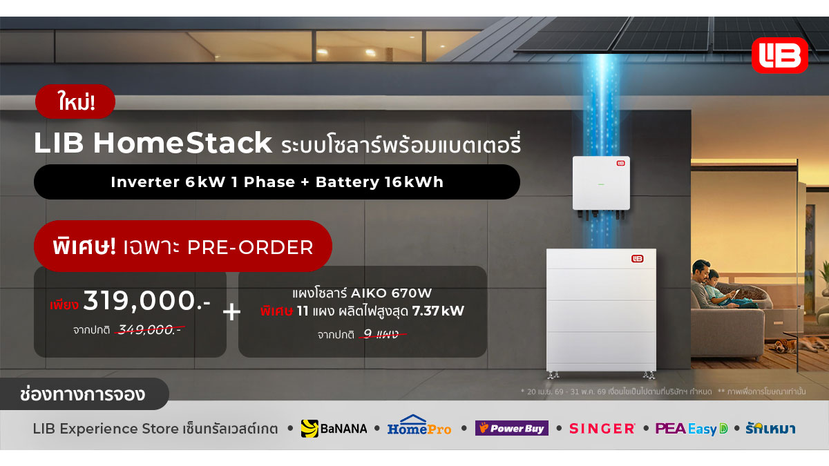 EnergyLIB เปิดพรีออเดอร์ LIB HomeStack ระบบโซลาร์ที่มาพร้อมอินเวอร์เตอร์ขนาด 6kW 1 Phase และแบตเตอรี่ขนาด 16kWh ได้ตั้งแต่วันที่ 20 เมษายน – 31 พฤษภาคม 2569 ราคาพิเศษเพียง 319,000 บาท จากปกติ 349,000 บาท และพิเศษแผงโซลาร์ 670W จำนวน 11 แผง มอบกำลังการผลิตไฟรวมสูงสุด 7.37kW จากปกติ 9 แผง โดยรวมทั้งบริการติดตั้งพื้นฐาน[3] รับประกัน[4] และบริการหลังการขาย ครบจบในที่เดียว พร้อมสามารถใช้สิทธิ์ลดหย่อนภาษีได้สูงสุด 200,000 บาท ตามเงื่อนไขที่กำหนด ที่ LIB Experience Store สาขาเซ็นทรัล เวสต์เกต ชั้น 2 รวมถึง BaNANA, HomePro, Power Buy, SINGER, PEA, รักเหมา และตัวแทนจำหน่ายที่ร่วมรายการทั่วประเทศ