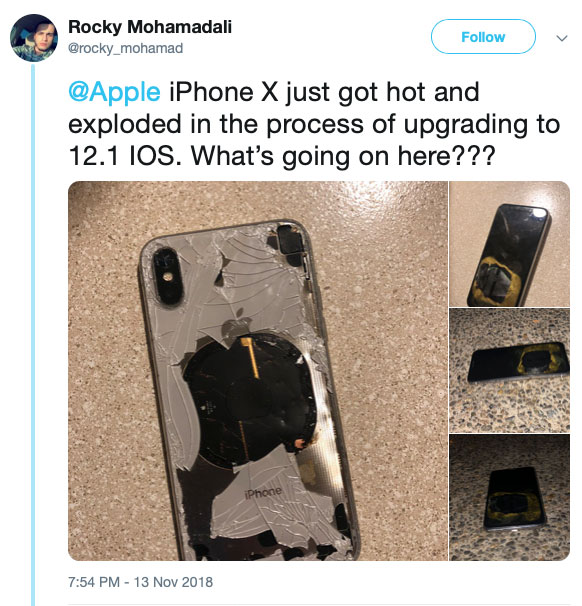 โดยเมื่อวันที่ 14 พฤศจิกายนที่ผ่านมา ทวิตเตอร์ของ @rocky_mohamad ได้ทวีตรูป iPhone X ได้รับความเสียหายจากการระเบิด พร้อมกับข้อความว่า iPhone X ตัวเครื่องร้อนจัดและระเบิดขณะทำการอัปเดตเป็น iOS 12.1 ซึ่งทางสื่อ Gadgets360 ได้ติดต่อเพื่อสอบถามรายละเอียดเพิ่มเติม ได้ความว่า ขณะทำการอัปเดต iPhone X ที่เจ้าตัวเพิ่งซื้อมาใช้งานได้แค่ 10 เดือน เป็น iOS 12.1 เมื่อจับตัวเครื่องก็พบว่า ร้อนมากจึงได้ปล่อยตัวเครื่องทิ้งทันที และพอเสร็จสิ้นการอัปเดตเป็น iOS 12.1 ก็เริ่มเกิดควันและลุกไหม้ ซึ่งเจ้าตัวเสริมว่า ขณะทำการอัปเดตนั้น ได้ทำการชาร์จไปด้วย โดยใช้สายชาร์จและ Adapter ของแท้จาก Apple