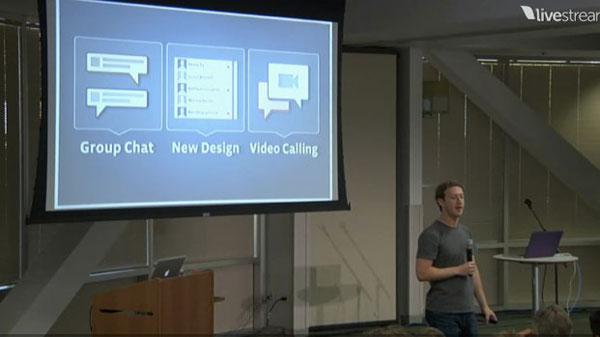Group ChatMark Zuckerberg ได้ให้เหตุผลว่า ครึ่งนึงของผู้ใช้งาน Facebook ในปัจจุบัน มักจะใช้ Groups ครับ (ลักษณะเดียวกับ Circles ใน Google+) จึงทำให้เกิดไอเดียสร้าง Group Chat ขึ้นมา เพื่อให้ใช้งาน Facebook ได้สนุกขึ้นและก็ง่ายขึ้นกว่าแต่ก่อนด้วยครับ อีกทั้ง ยังตอบสนองความต้องการของผู้ใช้ Facebook ในปัจจุบันอีกด้วย