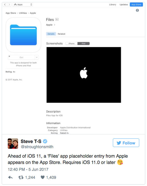 เหลือเวลาอีกไม่กี่อึดใจแล้ว กับการเปิดตัว iOS 11 ในงาน WWDC 2017 ช่วงเที่ยงคืนวันนี้ (ตามเวลาในประเทศไทย) และก่อนหน้างานเปิดตัวไม่นาน ได้มีผู้พบแอปพลิเคชันใหม่บน iOS 11 ที่มีชื่อว่า Files หลุดมาบน App Store