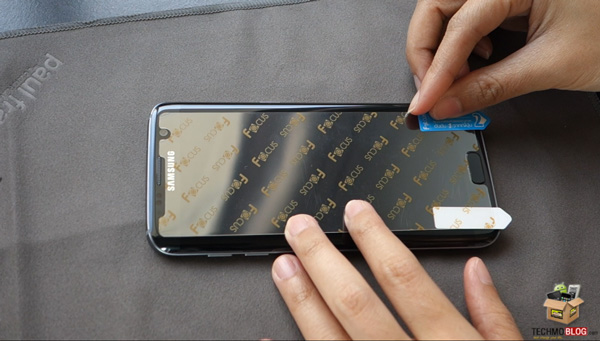 จากนั้น ใช้สก็อตเทปแปะฝุ่นที่เกาะบนหน้าจอ ซึ่งขั้นตอนนี้ถือว่า สำคัญอย่างมากเนื่องจากฝุ่นละออง จะทำให้การแปะฟิล์มไม่เรียบ และดูไม่สวยงาม ฉะนั้น ระหว่างการแปะฟิล์ม จะต้องคอยสังเกตด้วยว่า หน้าจอมีฝุ่นละอองหรือไม่
