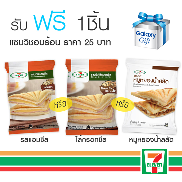 กรุงเทพฯ –25 สิงหาคม 2558 – อัพเดทโปรโมชั่นใหม่ จากซัมซุง กาแลคซี่กิ๊ฟ ที่เซเว่น อีเลฟเว่น เลือกรับฟรี แซนวิชอบร้อน 1 ชิ้น เฉพาะรสแฮมชีส, ไส้กรอกชีส, หมูหยองน้ำสลัด (อย่างใดอย่างหนึ่ง) ปกติราคา 25 บาท โดยสามารถรับสิทธิ์ได้ง่ายๆ เพียงเข้าแอพพลิเคชั่น Galaxy Gift กดรับสิทธิ์ และแสดงบาร์โค้ดที่หน้าเคาร์เตอร์เซเว่น อีเลฟเว่น ทุกสาขาทั่วประเทศ ก็สามารถอิ่มเบาๆ ได้ตั้งแต่วันที่ 26 สิงหาคม – 25 กันยายนเท่านั้น สิทธิ์มีจำนวนจำกัด