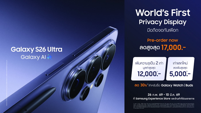*สำหรับ Samsung Experience Store และร้านค้าที่ร่วมรายการเงื่อนไขเป็นไปตามที่บริษัทกำหนด ดูเพิ่มเติมได้ที่ https://smsngshop.com/s26-preorder-pr
