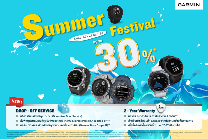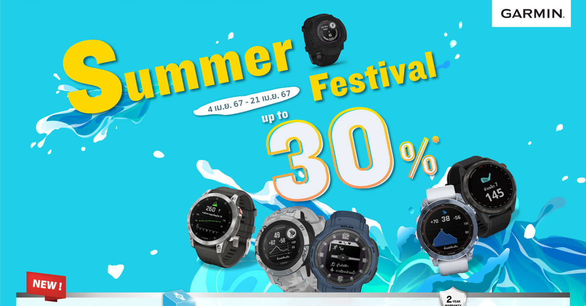 Garmin ผู้นำด้านผลิตภัณฑ์จีพีเอสสมาร์ทวอทช์ระดับโลก ต้อนรับฤดูร้อน ยกทัพสินค้าตัวดังร่วมจัดแคมเปญสุดร้อนแรง “Summer Festival ลดสูงสุด 30%” ตั้งแต่วันที่ 4-21 เมษายน 2567 นี้ ชวนคนไทยสวมใส่สมาร์ทวอทช์จาก Garmin เต็มอิ่มกับความคุ้มค่าคุ้มราคาครบฟังก์ชันกันแบบจุใจ เมื่อซื้อสินค้าที่ร่วมรายการ อาทิ Fenix 7 ซีรีย์ Epix ซีรีย์ Instinct 2 ซีรีย์ Instinct Crossover และ Approach S42 อัดเต็มความคุ้มค่ากับบริการหลังการขาย เดินหน้าอัพเกรด 2 เซอร์วิสล่าสุด ได้แก่ 1) ขยายช่องทางการส่งเคลมสินค้าให้ครอบครอบคลุมหลากหลายจุดทั่วประเทศไทย และ 2) ขยายระยะเวลารับประกันสินค้าเป็น 2 ปีเต็ม ตอกย้ำความมุ่งมั่นในการสร้างความเชื่อมั่นให้กับงานบริการและยกระดับความสะดวกสบายให้กับลูกค้าแบบไร้รอยต่อ
