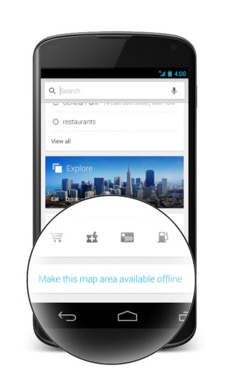 [12-กรกฏาคม-2556] หลังจากทนกระแสเรียกร้องจากผู้ใช้ไม่ไหว ล่าสุด กูเกิล ได้ปล่อยอัพเดท Google Maps for Android อีกครั้ง ซึ่งในครั้งนี้ ได้นำฟีเจอร์ การใช้แผนที่แบบออฟไลน์กลับมาด้วย ซึ่งได้เพิ่มเมนู “make this map area available offline” อยู่ในส่วนของหน้าค้นหาสถานที่ แต่จะถูกแยกออกมาเป็น card อีกใบ เมื่อกดเข้าไป ก็จะเข้าสู่การใช้แผนที่แบบออฟไลน์