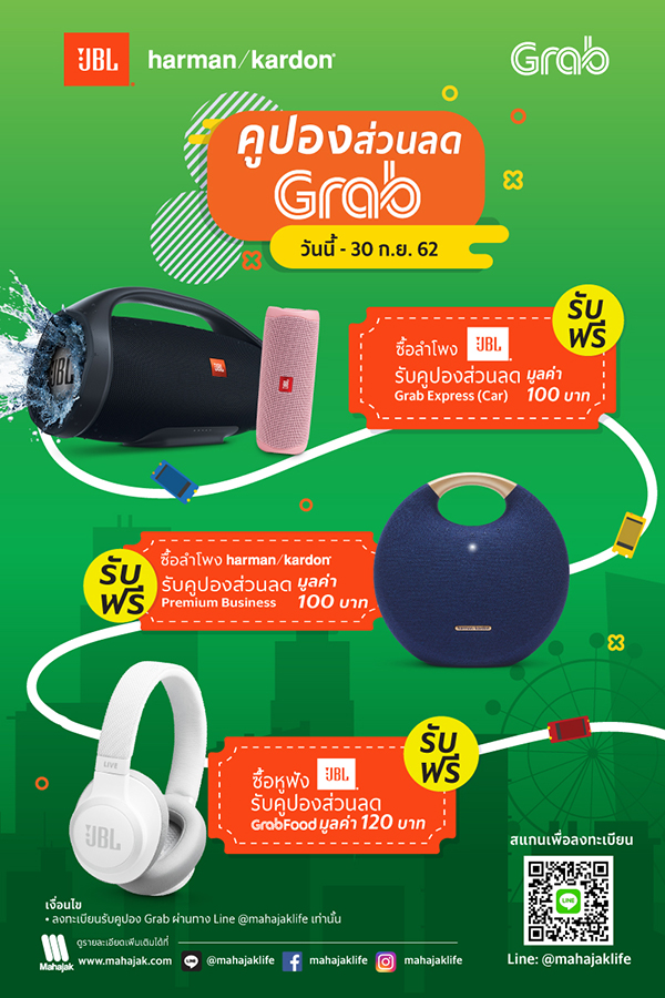 บริษัท มหาจักรดีเวลอปเมนท์ จำกัด ออกโปรโมชั่นโดนใจ คนใช้ Grab สายมิวสิคเลิฟเวอร์ ไม่ว่าคุณจะเดินทาง หรือสั่งอาหาร เพียงแค่ซื้อสินค้าจาก JBL หรือ Harman Kardon ก็รับไปเลยคูปองส่วนลด จาก Grab ฟรี! โดยมีรายละเอียดโปรโมชั่นดังนี้