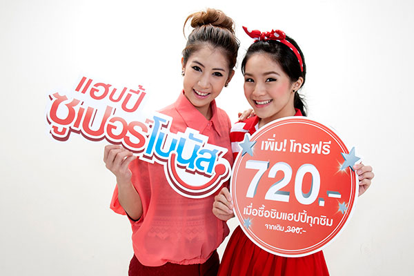 24 ธันวาคม 2555 - แฮปปี้จัดแคมเปญพิเศษต้อนรับลูกค้าใหม่ รับเทศกาลส่งท้ายปีเก่า ต้อนรับปีใหม่ เพิ่มแฮปปี้โทรฟรีให้แฮปปี้ซูเปอร์โบนัส ให้ลูกค้าโทรฟรีรวม 720 บาทตลอดทั้งปี เพียงเปิดใช้บริการซิมแฮปปี้ที่ร่วมรายการตั้งแต่วันนี้ถึงวันที่ 31 มกราคม 2556 และเมื่อใช้งานครบ 30 วัน ลูกค้าจะได้รับโบนัสทุกเดือน เดือนละ 60 บาท โดยไม่มีเงื่อนไข เป็นระยะเวลา 12 เดือน ใช้ได้นานเดือนละ 15 วัน