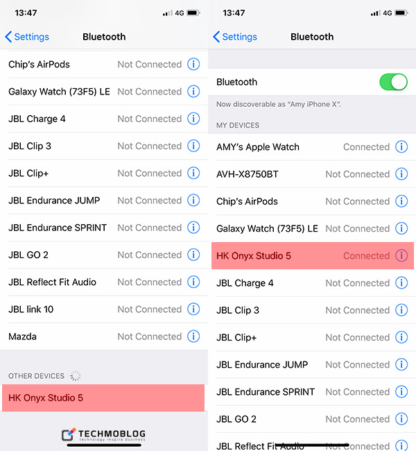 สำหรับการเชื่อมต่อลำโพงไร้สาย Onyx Studio 5 กับสมาร์ทโฟนก็ไม่ยุ่งยาก ด้วยการเปิดปุ่ม Power ที่ตัวเครื่อง และกดที่ปุ่ม Bluetooth 1 ครั้ง จากนั้นไปที่สมาร์ทโฟนด้วยการเข้าไปที่ Settings > Bluetooth แล้วเลือก HK Onyx Studio 5 เพื่อทำการเชื่อมต่อ