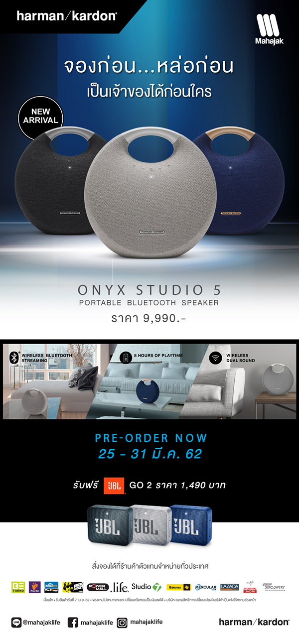 และล่าสุด ลำโพงไร้สาย harman/kardon Onyx Studio 5 เปิดพรีออเดอร์ในไทยแล้วระหว่างวันที่ 25-31 มีนาคม 2562 พร้อมโปรโมชั่นสุดพิเศษ รับฟรี! ลำโพง JBL GO 2 ราคา 1,490 บาท โดยผู้ที่สนใจสามารถสั่งจองได้ที่ร้านตัวแทนจำหน่ายทั่วประเทศ ซึ่งได้แก่ BE TREND, Power Buy, The Power (HomePro), Munkong Gadget, Power Mall, .life, Studio 7, BananaIT, Mercular.com, Lazada, jd.co.th และที่ Siam Discovery
