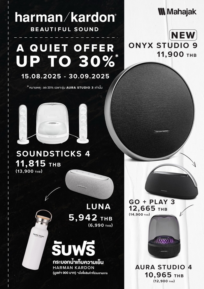 บริษัท มหาจักรดีเวลอปเมนท์ จำกัด เชิญคุณสัมผัสประสบการณ์เสียงเหนือระดับกับแคมเปญ A Quiet Offer จาก Harman Kardon แบรนด์เครื่องเสียงดีไซน์พรีเมียม ที่มาพร้อมข้อเสนอสุดเอ็กซ์คลูซีฟ มอบส่วนลดสูงสุดถึง 30% พร้อมรับของแถมสุดพรีเมียม กระบอกน้ำเก็บความเย็น Harman Kardon มูลค่า 900 บาท เมื่อซื้อสินค้าที่ร่วมรายการ