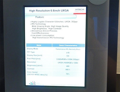 Hitachi ซุ่มมาเงียบๆแล้วก็เปิดเผยถึงหน้าจอ IPS (จอเทคโนโลยีเดียวกับ iPad และ Mac) ด้วยความละเอียด 1600x1200 จุดบนขนาดหน้าจอ 6.6 นิ้ว ทำให้ความหนาแน่นของจุดสูงถึง 302 ppi เปรียบเทียบกับ