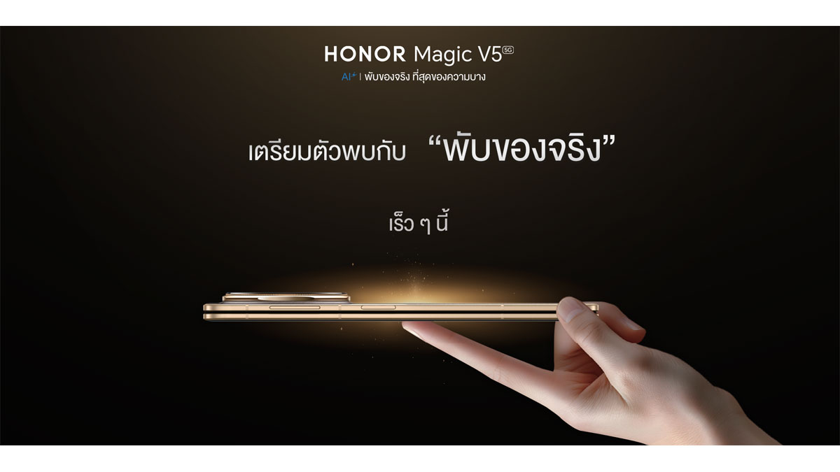 ออเนอร์ (HONOR) เตรียมเปิดตัว HONOR Magic V5 สมาร์ตโฟนจอพับระดับไฮเอนด์รุ่นล่าสุดในประเทศไทยอย่างเป็นทางการ ภายใต้ คอนเซปต์ ‘พับของจริง ที่สุดของความบาง – Slimmest with No Compromise’ ชูจุดเด่น “บางที่สุดในโลก” ด้วยตัวเครื่องบางเพียง 8.8 มิลลิเมตร ขณะพับหน้าจอ ช่วยให้ผู้ใช้พกพาสะดวกคล่องตัว พร้อมมอบประสบการณ์การใช้งานระดับแฟลกชิป ด้วยขุมพลัง Advance AI รองรับการทำงานแบบมัลติทาสก์อย่างเต็มประสิทธิภาพ พร้อมรองรับปากกา HONOR Magic Pen เพื่อการใช้งานที่แม่นยำและลื่นไหลยิ่งขึ้น อีกทั้งยังเสริมความมั่นใจด้วยมาตรฐานความทนทานระดับ IP58 และ IP59 ป้องกันน้ำและฝุ่นในทุกสถานการณ์ ตอบโจทย์ทั้งกลุ่มนักธุรกิจและผู้ใช้งานที่หลงใหลในนวัตกรรมล้ำสมัย เตรียมพร้อมเปิดตัวในประเทศไทยอย่างเป็นทางการและพบกันเร็ว ๆ นี้