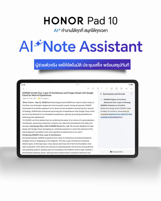 HONOR Pad 10 มอบประสบการณ์การทำงานที่เหนือกว่าด้วยการใช้งานควบคู่กับปากกาและคีย์บอร์ด มาพร้อมความรู้สึกในการเขียนที่มั่นคงและลื่นไหล ให้ผู้ใช้จดบันทึก พิมพ์งาน และจัดการเอกสารได้สะดวก ราวกับมี PC ขนาดพกพา อยู่กับตัวตลอดเวลา เสริมประสิทธิภาพด้วยฟีเจอร์ AI อัจฉริยะ ที่ช่วยให้งานเสร็จไว เป็นระเบียบ และมีความเป็นมืออาชีพมากยิ่งขึ้น อาทิ Advance AI Handwriting Beautification แปลงลายมือให้เป็นข้อความเรียบร้อย อ่านง่ายทันที Advance AI Writing Tools ช่วยร่าง แก้ไข และตรวจสอบเอกสารครบวงจร รองรับหลายภาษา Advance AI Notes & Recorder ระบบจดบันทึกอัจฉริยะที่ทำงานร่วมกับการบันทึกเสียง รองรับภาษาไทย Advance AI Summary & Format สรุปใจความสำคัญและจัดระเบียบเอกสารให้อ่านง่าย ดูเป็นทางการ และ Advance AI Minutes ผู้ช่วยตัวจริงสำหรับการประชุม แปลงเสียงพูดเป็นรายงานการประชุมอัตโนมัติ ด้วยการผสานเทคโนโลยี AI เข้ากับปากกาและคีย์บอร์ด HONOR Pad 10 จึงเป็นอุปกรณ์ที่ตอบโจทย์ทั้งคนทำงาน และนักเรียนนักศึกษา ที่ต้องการเครื่องมือดิจิทัลครบจบในหนึ่งเดียว