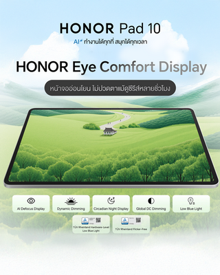 HONOR Pad 10 มาพร้อมหน้าจอ TFT LCD ขนาด 12.1 นิ้ว ความละเอียด 2.5K (2560x1600 พิกเซล) อัตราส่วนหน้าจอต่อตัวเครื่องสูงถึง 88% ให้มุมมองกว้างเต็มตา และขอบเขตสีที่กว้างระดับ DCI-P3 พร้อมอัตรารีเฟรชสูงสุด 120Hz ทำให้การเลื่อนหน้าจอ การเล่นเกม และการแสดงผลอนิเมชันลื่นไหลสมจริง ตอบสนองทันใจ เพื่อการใช้งานที่สบายตาแท็บเล็ตรุ่นนี้มาพร้อม HONOR Eye Protection ผ่านการรับรองจาก TÜV Rheinland ทั้ง Low Blue Light (โซลูชันฮาร์ดแวร์) และ Flicker Free Eye Comfort ช่วยลดแสงสีฟ้าและการกระพริบของหน้าจอ ลดความเมื่อยล้าของสายตา พร้อม Dynamic Dimming ปรับความสว่างให้ใกล้เคียงแสงธรรมชาติ และ Circadian Night Display ปรับแสงอัตโนมัติหลังพระอาทิตย์ตกเพื่อส่งเสริมคุณภาพการนอน นอกจากนี้ เทคโนโลยี Advance AI Defocus ช่วยปรับเนื้อหาบางส่วนบนหน้าจอให้เกิดเอฟเฟกต์เหมือนเลนส์เบลอ ลดความตึงเครียดและความเมื่อยล้าของสายตา HONOR Pad 10 จึงมอบประสบการณ์ภาพคมชัด สบายตา และเป็นมิตรต่อสุขภาพดวงตาอย่างแท้จริง