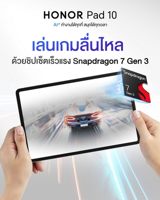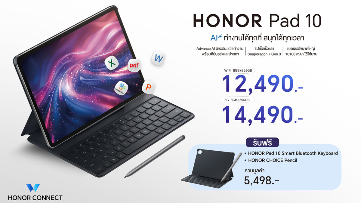 ออเนอร์ (HONOR) เปิดตัว HONOR Pad 10 แท็บเล็ตรุ่นใหม่ล่าสุด ที่ยกระดับประสบการณ์ใช้งานให้ใกล้เคียงกับพีซี ภายใต้คอนเซปต์ “ทำงานได้ทุกที่ สนุกได้ทุกเวลา” ตอบโจทย์ผู้ใช้งานยุคใหม่ที่มองหาแท็บเล็ตครบเครื่อง มาพร้อมปากกาและคีย์บอร์ดในราคาที่คุ้มค่าที่สุดในตลาดประเทศไทย โดดเด่นด้วย AI อัจฉริยะที่ช่วยจัดการงานต่าง ๆ ได้อย่างคล่องตัว ครอบคลุมทั้งการทำงาน การเรียน และความบันเทิงแบบครบวงจร พร้อมหน้าจอถนอมสายตาขนาดใหญ่ 12.1 นิ้ว ความละเอียด 2.5K เพื่อการรับชมภาพและวิดีโอที่ เต็มอรรถรส ขับเคลื่อนด้วยชิปเซ็ต Snapdragon 7 Gen 3 รองรับ 5G และแบตเตอรี่ทรงพลัง 10,100mAh ที่ให้การใช้งานต่อเนื่องยาวนาน ทั้งหมดนี้ในราคาที่เข้าถึงง่าย คุ้มค่าในราคาเริ่มต้นเพียง 12,490 บาท