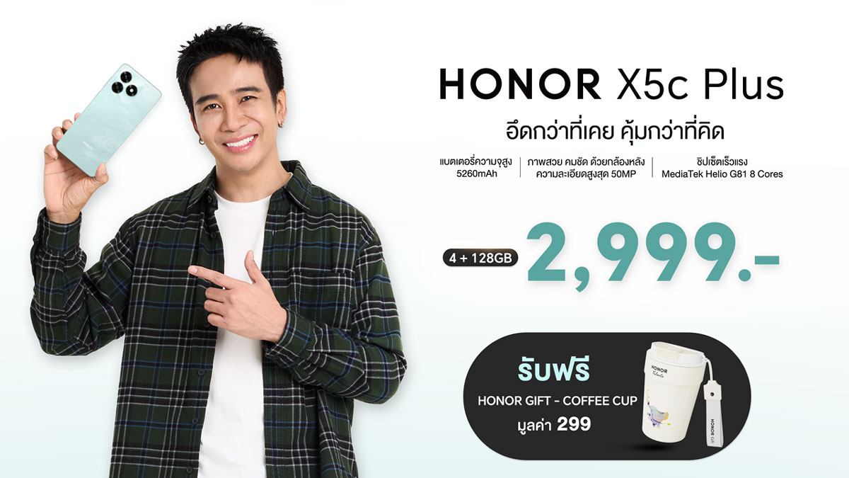 HONOR X5c Plus ราคา 2,999 บาท มี 2 สี ได้แก่ สี Meteor Silver และ สี Ocean Cyan รับโปรโมชันพิเศษเมื่อซื้อ HONOR X5c Plus รับฟรี HONOR Gift – Coffee Cup มูลค่า 299 บาท ตั้งแต่วันที่ 23 มกราคม 2569 ถึงวันที่ 28 กุมภาพันธ์ 2569 หรือจนกว่าของแถมจะหมด จำหน่ายที่ HONOR Experience Store ทุกสาขา และร้านค้าตัวแทนจำหน่ายทั่วประเทศ หรือ https://url.in.th/yKDRs