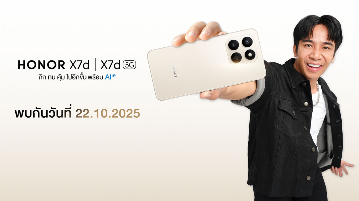 HONOR X7d Series มีทั้งหมด 2 รุ่น ได้แก่ HONOR X7d 4G (8+256GB) และ HONOR X7d 5G (8+256GB) โดดเด่นด้วยมาตรฐาน กันน้ำ กันฝุ่นระดับ IP65 และการรับรองระดับพรีเมียม 5 ดาว จาก SGS ที่สามารถทนต่อการตกกระแทกสูงสุด 2 เมตร มอบความมั่นใจในทุกสถานการณ์ พร้อมปุ่ม AI Button ที่ช่วยเข้าถึงคำสั่งและฟีเจอร์สำคัญได้อย่างรวดเร็ว เสริมด้วยฟีเจอร์ AI Eraser ที่ช่วยลบสิ่งรบกวนในภาพได้อย่างแนบเนียนและเป็นธรรมชาติ อีกทั้งยังมาพร้อมแบตเตอรี่ขนาดใหญ่ 6,500mAh ที่รองรับการใช้งานได้ยาวนานตลอดวัน ตอบโจทย์ผู้ใช้งานที่ต้องการสมาร์ตโฟนสุดอึดในราคาสบายกระเป๋า เตรียมเปิดราคาอย่างเป็นทางการในประเทศไทยวันที่ 22 ตุลาคม 2568 พร้อมข้อเสนอสุดพิเศษที่ไม่ควรพลาด!