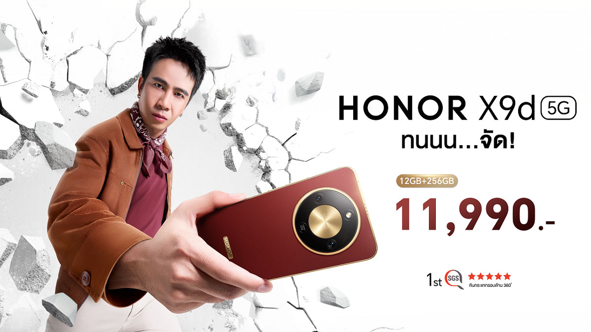 ออเนอร์ (HONOR) เดินหน้ารุกตลาดสมาร์ตโฟนไทย ส่งท้ายปีด้วยการเปิดตัว HONOR X9d 5G อย่างเป็นทางการ ภายใต้สโลแกน “ทนนน...จัด!” โดยสมาร์ตโฟนรุ่นนี้สร้างมาตรฐานใหม่ให้เป็นสมาร์ตโฟนระดับกลางที่ทรงพลังที่สุดในตลาด โดดเด่นด้วยโครงสร้างสุดแข็งแกร่ง รองรับการตกกระแทกสูงสุด 2.5 เมตร พร้อมผ่านมาตรฐานกันน้ำกันฝุ่นระดับสูงสุดครอบคลุมทั้ง IP69K, IP69, IP68 และ IP66 ผสานสมรรถนะด้านการใช้งานเหนือชั้นด้วยแบตเตอรี่ขนาด 8,300mAh ซึ่งเป็นความจุที่ใหญ่ที่สุดในตลาดสมาร์ตโฟนปัจจุบัน ขณะที่ด้านการถ่ายภาพมาพร้อมกล้อง AI Camera อัจฉริยะ ความละเอียด 108MP เสริมด้วยระบบกันสั่นคู่ OIS + EIS ช่วยให้ผู้ใช้เก็บภาพได้คมชัดทุกสภาพแสง ด้วยการออกแบบที่ตอบโจทย์ทุกความต้องการของผู้ใช้รุ่นใหม่ ทั้งความทนทาน ประสิทธิภาพ และประสบการณ์การถ่ายภาพที่ครบเครื่อง HONOR X9d 5G จึงนับเป็นหนึ่งในสมาร์ตโฟนระดับกลางที่คุ้มค่าที่สุดในตลาด เปิดตัวในราคา 11,990 บาท นอกจากนี้ ยังสร้างสีสันด้วยการดึงศิลปินลูกทุ่งชื่อดัง ‘ก้อง ห้วยไร่’ กลับมาเป็นพรีเซนเตอร์ และ HONOR’s Friend เป็นปีที่สอง เพื่อสะท้อนภาพลักษณ์ความแกร่ง คุ้มค่า และเข้าถึงผู้ใช้ทุกกลุ่มได้อย่างลงตัว