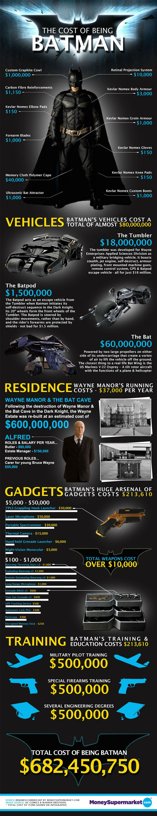 เริ่มกันที่เสื้อผ้า ที่แพงสุดคงจะเป็นหน้ากากนั่นเอง เนื่องจากผลิตมาจากแกรไฟต์ โดยมีมูลค่าถึง 1 ล้านเหรียญสหรัฐฯ ส่วนยานพาหนะของ Batman นั้น มีทั้งหมด 3 แบบคือ The Tumbler, The Batpod และ The Bat ซึ่ง The Bat มีมูลค่าถึง 60 ล้านเหรียญสหรัฐฯ เลยทีเดียวครับ ส่วน Alfred หัวหน้าพ่อบ้านของ Bruce Wayne หรือ Batman ของเรา ที่ทำหน้าที่แทบจะทุกอย่างในบ้าน เงินเดือนตกปีละ 2.3 แสนเหรียญสหรัฐฯ ก็ประมาณ 7 ล้านบาทครับ