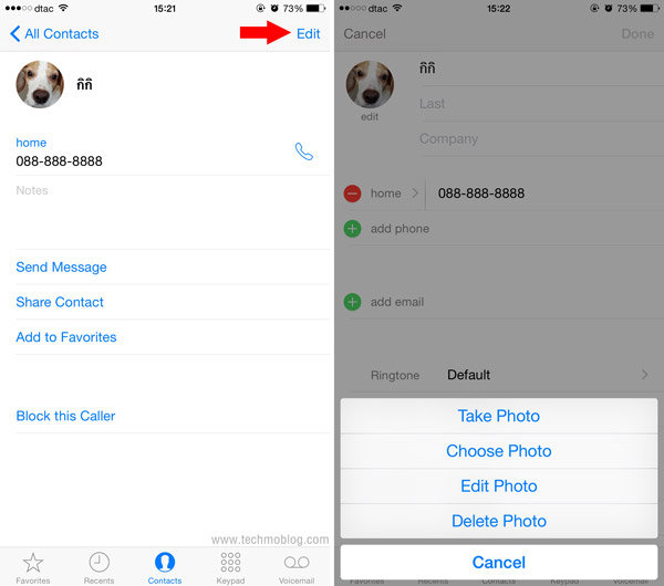 นอกจากวิธีข้างต้นแล้ว เรายังสามารถเพิ่มรูปให้กับรายชื่อผู้ติดต่อได้ ด้วยการเข้าไปที่ รายชื่อที่ต้องการจะแก้ไข เลือก Edit > คลิกที่รูปภาพ แล้วเลือกเมนูตามที่ต้องการครับ โดยสามารถเลือกได้ทั้ง ถ่ายรูปใหม่, เลือกภาพที่อยู่ใน Photos, แก้ไขภาพ หรือลบรูปภาพนี้