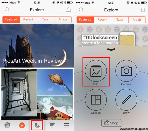 เปิดแอพฯ PicsArt คลิกที่ปุ่มตรงกลาง เลือก Edit