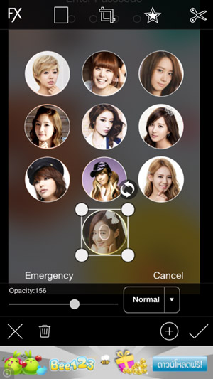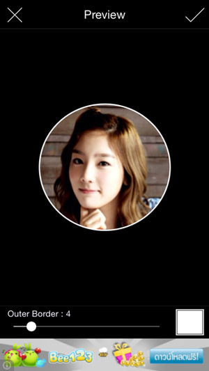 ให้คลิกรูปที่ปรากฏขึ้นมา แล้วคลิกที่ไอคอนรูปดาว เลือกกรอบแบบวงกลม จากนั้นปรับขนาดให้พอดีกับใบหน้า แล้วคลิกเครื่องหมายถูก