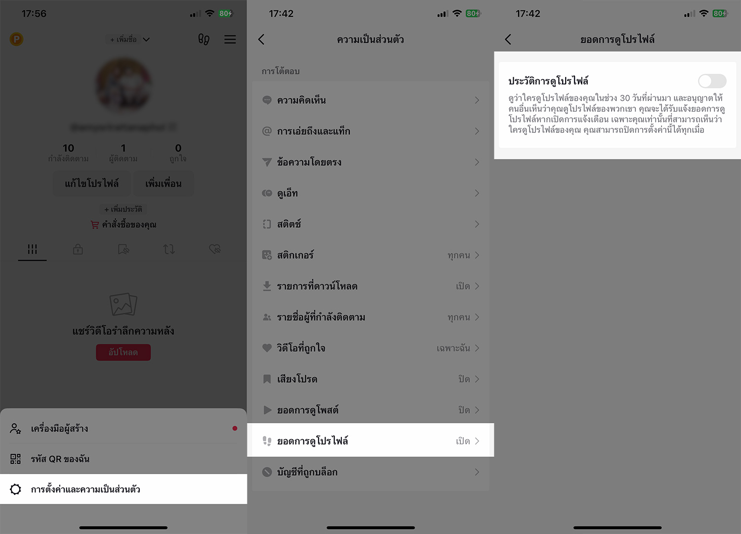 แตะที่การตั้งค่าและความเป็นส่วนตัว > ความเป็นส่วนตัว แตะที่ยอดการดูโปรไฟล์ ตรงประวัติการดูโปรไฟล์ ให้ปิด (สีเทา) เป็นอันเรียบร้อย