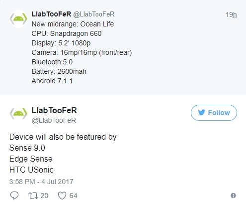 LlabTooFeR แหล่งข่าวหลุดชั้นดีบน Twitter ที่มักจะให้ข้อมูลเกี่ยวกับสมาร์ทโฟนรุ่นใหม่ๆ ของ HTC อยู่เป็นประจำ ได้เปิดเผยว่า HTC กำลังซุ่มพัฒนามือถือระดับกลางรุ่นใหม่ล่าสุดในซีรีส์ HTC U11 ภายใต้โค้ดเนม Ocean Life ซึ่งแม้ว่าจะเป็นเรือธงรุ่นเล็กที่ลดสเปกลง แต่ยังคงมาพร้อมกับจุดเด่นด้านฟีเจอร์การบีบเหมือนกับรุ่น HTC U11 เช่นเดิม โดย Ocean Life จะถูกลดขนาดหน้าจอเหลือ 5.2 นิ้ว ขับเคลื่อนด้วยขุมพลังตัวแรง Snapdragon 660 พร้อมระบบเสียง HTC USonic และชูจุดเด่นด้านการถ่ายภาพด้วยกล้องดิจิทัลความละเอียด 16 ล้านพิกเซลเท่ากันทั้งด้านหน้า และด้านหลัง ซึ่งยังไม่มีข้อมูลแน่ชัดว่า จะได้ใช้เซ็นเซอร์รับภาพตัวเดียวกับรุ่น HTC U11 ด้วยหรือไม่ สำหรับคุณสมบัติเบื้องต้นของ HTC Ocean Life มีดังต่อไปนี้