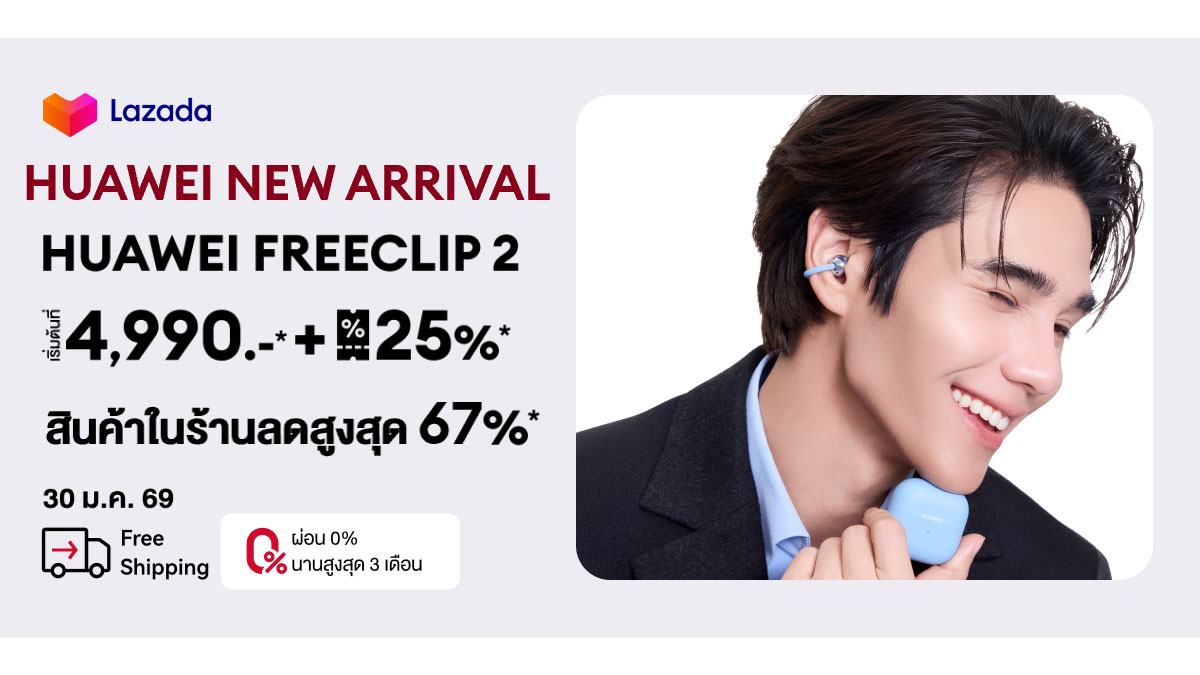 หัวเว่ย คอนซูมเมอร์ บิสสิเนส กรุ๊ป (ประเทศไทย) ตอกย้ำความสำเร็จของหัวเว่ยในฐานะแบรนด์เทคโนโลยีระดับโลกที่โดดเด่นด้านนวัตกรรมและดีไซน์ ด้วยการเปิดตัว HUAWEI FreeClip 2 กับแคมเปญ Lazada Huawei New Arrival ที่สุดของหูฟัง Open-ear ที่ต่อยอดจากความนิยมของซีรีส์ FreeClip และได้รับการตอบรับอย่างต่อเนื่องจากผู้ใช้งานทั่วโลก พร้อมมอบโปรโมชันพิเศษ คูปองส่วนลดสูงสุด 25% เฉพาะวันที่ 30 มกราคม 2569 เท่านั้น บน Lazada