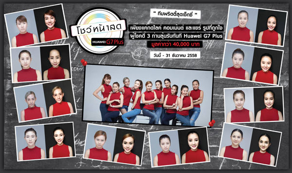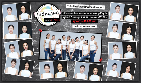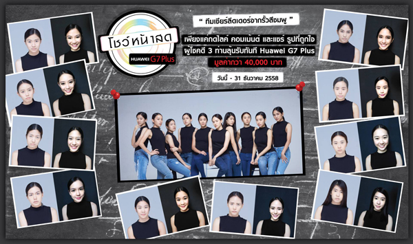 หัวเว่ย คอนซูมเมอร์ บิสสิเนส กรุ๊ป (ประเทศไทย) ผู้ผลิตแอนดรอยด์ สมาร์ทโฟนอันดับสองของโลก จัดกิจกรรม “โชว์หน้าสด” ให้แฟนๆร่วมโหวตสาวสวยหน้าสด 30 คนจาก 3 ทีมในดวงใจไม่ว่าจะเป็นทีมพริตตี้สุดเซ็กซี่ ทีมเชียร์ลีดเดอร์จากรั้วสีชมพู และทีมเชียร์ลีดเดอร์จากรั้วสีเหลืองแดง ที่ใช้โหมด Make Up เปลี่ยนหน้าสดให้สวยใสได้แม้ตอนไม่แต่งหน้า ด้วยกติกาง่ายๆ เพียงเข้าไปที่ www.facebook.com/HuaweiDeviceThailand โดยหัวเว่ยจะสุ่มหาผู้โชคดีที่มีคอมเม้นท์เด็ดโดนใจ พร้อม กดไลค์ กดแชร์ ครบทั้ง 3 ขั้นตอน รับเลยสมาร์ทโฟน หัวเว่ย จีเจ็ด พลัส ราคาเครื่องละ 12,990 บาท ฟรีทันที รวม 3 รางวัล มูลค่ากว่า 40,000 บาท ร่วมโหวตได้ตั้งแต่วันนี้ – 31 ธันวาคม 2558 และประกาศผลรางวัลในวันที่ 5 มกราคม 2559 ที่ www.facebook.com/HuaweiDeviceThailand สามารถติดตามข้อมูลข่าวสารเกี่ยวกับกิจกรรมโชว์หน้าสด ได้ที่: