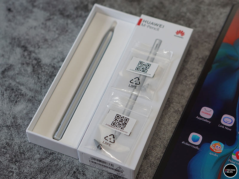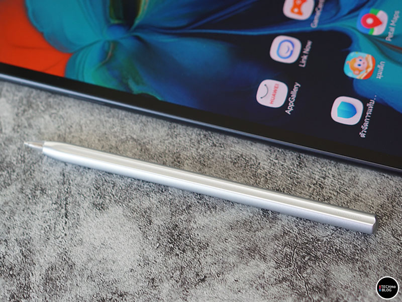 อุปกรณ์เสริมที่รองรับการใช้งานร่วมกับ HUAWEI MatePad Pro 12.6-inch ก็มี 2 อย่างด้วยกัน อย่างแรกก็คือ ปากกา HUAWEI M-Pencil เจเนอเรชันที่ 2 ที่ได้รับการออกแบบใหม่ให้จับถนัดมือมากขึ้น โดยจะเห็นว่า ฐานของตัวปากกาจะเป็นรอยบากเพื่อป้องกันการกลิ้งตกจากโต๊ะ อีกทั้งยังมีเซ็นเซอร์ที่ช่วยเพิ่มความแม่นยำในการเขียน และมีความหน่วงน้อยลง รองรับแรงกดที่ 4,096 ระดับ