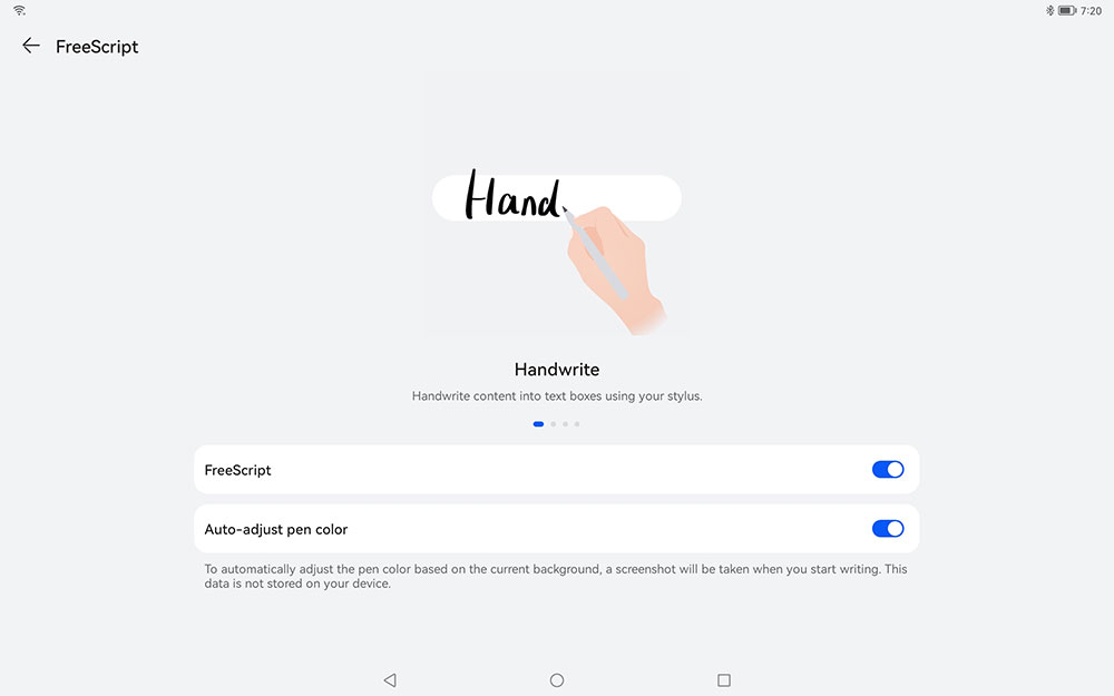 นอกจากนี้ ยังมีฟังก์ชันใหม่ที่เรียกว่า FreeScript ซึ่งจะเป็นการเปลี่ยนลายมือให้เป็นตัวพิมพ์ ซึ่งจากการทดสอบพบว่า รองรับการใช้งานในช่องการค้นหาผ่านเบราว์เซอร์ รวมถึงแอปพลิเคชันจดบันทึก อย่างเช่น HUAWEI NotePad, WeNote และ Noteshelf โดยรองรับการแปลงเป็นภาษาไทยด้วย แต่จะต้องเปลี่ยนภาษาในตัวเครื่องให้เป็นภาษาไทยเสียก่อน