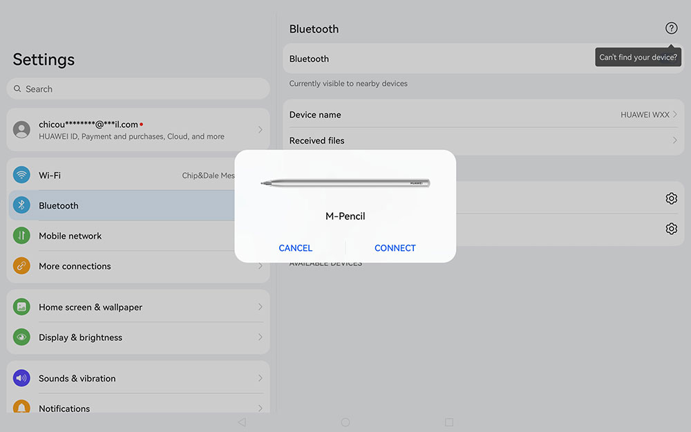 ส่วนการเชื่อมต่อปากกา HUAWEI M-Pencil กับแท็บเล็ต HUAWEI MatePad Pro 12.6-inch เป็นครั้งแรก เพียงแค่แปะตัวปากกาที่ขอบด้านบนตัวเครื่อง จะมีหน้าต่างให้เชื่อมต่อปรากฏขึ้นมา ซึ่งการชาร์จปากกาก็แค่แปะที่ตัวเครื่อง