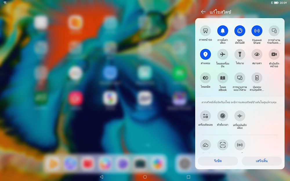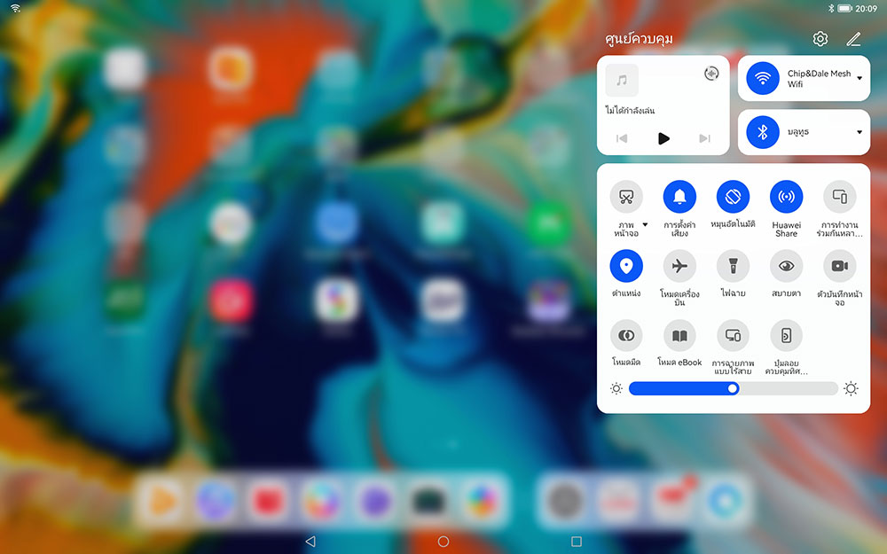 การปัดลงจากมุมบนขวา จะเป็นศูนย์ควบคุม ซึ่งเป็นเมนูลัดสำหรับตั้งค่าการใช้งานต่าง ๆ ทั้งการเปิด-ปิด Wi-Fi, เปิด-ปิด Bluetooth, เปิด-ปิดโหมด HUAWEI Share, โหมดมืด, โหมด eBook และสามารถปรับความสว่างของหน้าจอได้ รวมถึงควบคุมการเล่นเพลงได้จากส่วนนี้เช่นกัน