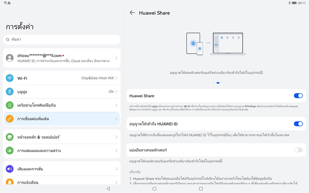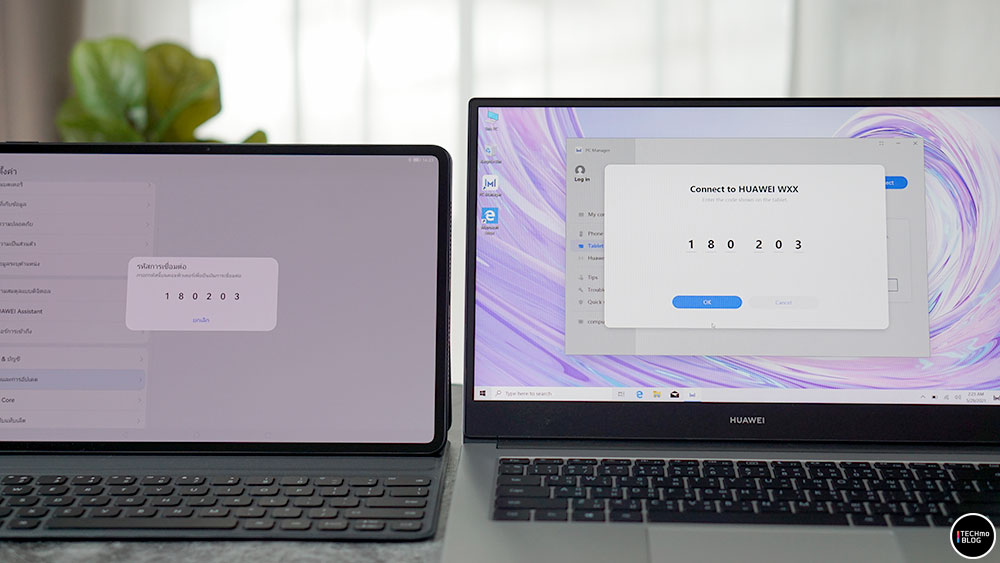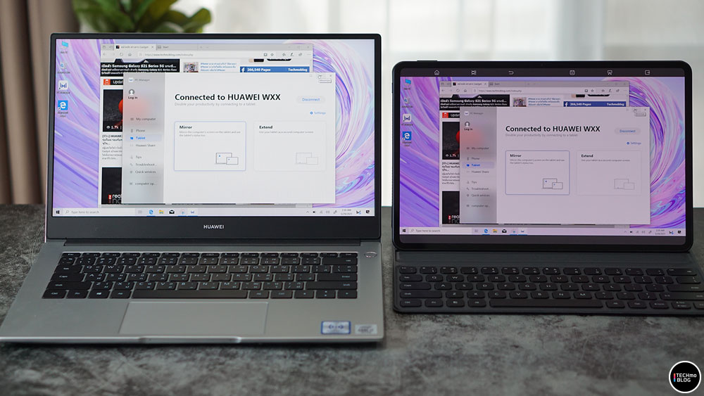 HUAWEI Multi-Screen Collaboration with Laptop เป็นอีกหนึ่งฟีเจอร์ที่ถือว่ามีประโยชน์อย่างมากสำหรับผู้ใช้ ซึ่งจะเป็นการเชื่อมต่อการทำงานระหว่างแล็ปท็อป HUAWEI กับแท็บเล็ต โดยจะต้องทำการจับคู่ (pair) ทั้ง 2 อุปกรณ์เสียก่อน ซึ่งบนแท็บเล็ตให้เปิดฟีเจอร์ดังกล่าวผ่านทางศูนย์ควบคุม (จะต้องเปิด Bluetooth ทั้ง 2 อุปกรณ์ด้วย)จากนั้นจะมีหน้าต่างแจ้งเตือนให้จับคู่ระหว่าง 2 อุปกรณ์