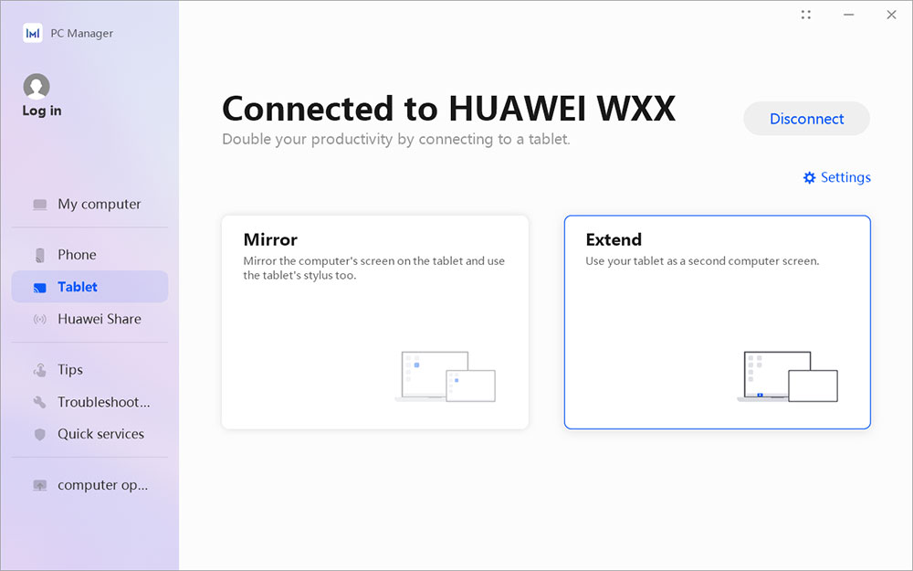 โดยบนแล็ปท็อป HUAWEI จะควบคุมฟีเจอร์นี้ผ่านทางแอปพลิเคชันที่มีชื่อว่า PC Manager ซึ่งเมื่อจับคู่ทั้ง 2 อุปกรณ์เรียบร้อยแล้ว จะสามารถควบคุมการทำงานได้ 2 โหมดด้วยกันคือ
