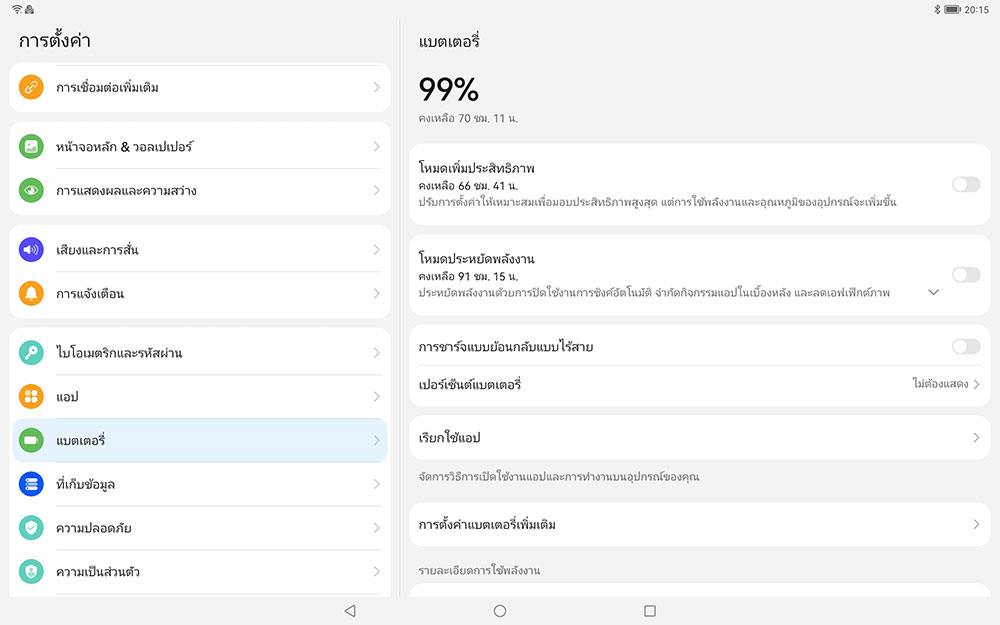 นอกจากจะมีโหมดประหยัดพลังงานแล้ว HUAWEI MatePad Pro 12.6-inch ยังรองรับฟีเจอร์ Reverse Wireless Charge) สามารถเป็นแบตเตอรี่สำรองแบบไร้สายให้กับอุปกรณ์อื่นได้ โดยมีกำลังไฟที่ 10W