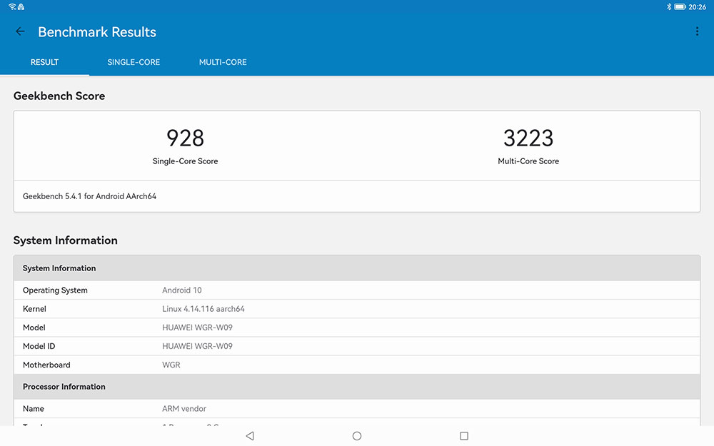 ทดสอบ Benchmark ด้วยแอปพลิเคชัน Geekbench 5 พบว่า ทำคะแนนได้ 928 คะแนน (Single-Core) และ 3,223 คะแนน (Multi-Core)