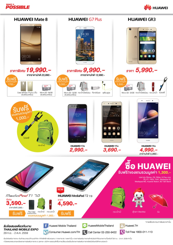 นอกจากนั้น หัวเว่ยยังมอบข้อเสนอสุดพิเศษ เฉพาะลูกค้า 100 คนแรกที่ซื้อ MediaPad M3 ที่งานไทยแลนด์ โมบายล์ เอ็กซ์โป จะได้รับลำโพง harman/kardon รุ่น Onyx Studio 2 มูลค่า 7,990 และของรางวัลอื่นๆ มูลค่า 3,600 บาทฟรีทันที และลูกค้าที่ซื้อ หัวเว่ย P9/P9 Plus รับฟรี ชุดอุปกรณ์ถ่ายภาพ และ Micro SD 62 GB รวมมูลค่า 2,600 บาท และพบสินค้าหัวเว่ยในราคาพิเศษสุดได้ที่หัวเว่ยแบรนด์ช็อป และร้านค้าตัวแทนจำหน่ายที่เข้าร่วมรายการทั่วประเทศ 29 กันยายน – 2 ตุลาคม 2559 เท่านั้น