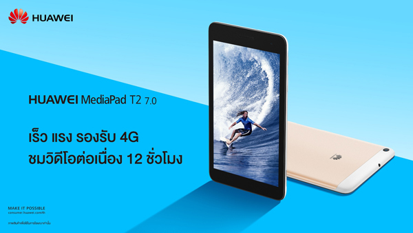 ส่วน MediaPad T2 7.0 คือแฟบเล็ตรุ่นแฟล็กชิพ อุปกรณ์ไฮบริดผสานสมาร์ทโฟนและแท็บเล็ตที่ทั้งเร็ว แรง พร้อมรูปลักษณ์ที่มีสไตล์ หน้าจอความละเอียดสูงขนาด 7 นิ้ว พร้อมประสิทธิภาพอันโดดเด่นเพื่อการใช้งานที่รวดเร็ว ลื่นไหล ทั้งแช็ตกับเพื่อน ชมวีดิโอออนไลน์ หรือเพลินเพลินกับเกมสุดโปรด รองรับ 4G LTE สามารถดาวน์โหลดด้วยความเร็ว 150 เมกะไบท์ต่อวินาที ให้ประสบการณ์การชมวิดีโอความละเอียดสูงต่อเนื่องตลอด 12 ชั่วโมงโดยไม่สะดุด พร้อมระบบการรักษาความปลอดภัยให้ไฟล์ข้อมูล และเพิ่มหน่วยความจำด้วยเอสดีการ์ดได้สูงสุดถึง 128 กิกะไบต์ ในราคาเพียง 4,590 บาท