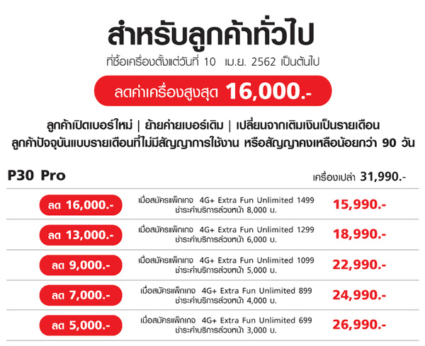 โดยค่าบริการล่วงหน้า 8,000 บาทนั้น สามารถเป็นส่วนลดค่าบริการรายเดือน 10 เดือนแรกได้อีกเดือนละ 800 บาท ราคาแพ็กเกจอาจจะดูแพงไปนิด แต่ใครที่เน้นใช้งานเรื่องโทรเยอะเน็ตเยอะมากเป็นพิเศษอยู่แล้ว แพ็กเกจนี้ถือว่าคุ้มค่า แถมซื้อเครื่อง Huawei P30 Pro ได้ในราคาถูกกว่าแพ็กเกจอื่นอีกด้วย