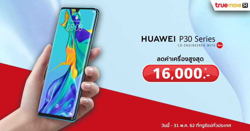 หลังจากที่ Huawei P30-Series ทั้ง 3 รุ่น ซึ่งได้แก่ Huawei P30 Pro, Huawei P30 และรุ่นเล็ก Huawei P30 Lite ได้เปิดพรีออเดอร์ในไทยไปเมื่อไม่นานมานี้ พร้อมกับกระแสตอบรับที่ท่วมท้นเกินความคาดหมาย ล่าสุด Huawei P30-Series ทั้ง 3 รุ่น ได้ฤกษ์วางจำหน่ายในไทยอย่างเป็นทางการแล้วเมื่อวันที่ 10 เมษายน 2562 ที่ผ่านมา และทาง TrueMove H ก็ไม่รอช้า ปล่อยโปรโมชั่นของ Huawei P30 Pro ออกมาได้อย่างน่าสนใจ กับส่วนลดค่าเครื่องสูงสุด 16,000 บาท เรียกได้ว่า ลดไปราว ๆ 50% เลยทีเดียว ซึ่งใครที่เป็นลูกค้าของ TrueMove H อยู่แล้ว หรือกำลังจะย้ายค่ายมาใช้ทรู อาจจะได้ Huawei P30 Pro ติดไม้ติดมือกลับบ้านแบบไม่รู้ตัวก็เป็นได้
