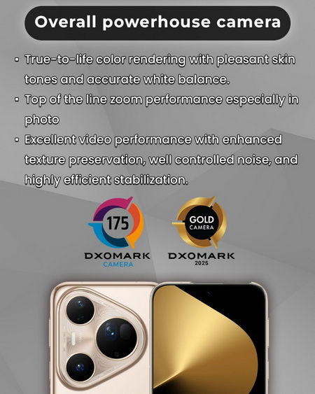 HUAWEI Pura 80 Ultra ได้รับการยกย่องจาก DXOMARK ด้วย 3 ความสามารถอันโดดเด่น ได้แก่ คะแนนภาพถ่ายสูงสุดเป็นประวัติการณ์ที่ 180 คะแนน คะแนนวิดีโอที่ทำได้ 166 คะแนนซึ่งเทียบเท่าอันดับหนึ่ง และความสามารถด้านเทเลโฟโต้ที่ได้รับการจัดอันดับสูงสุดในการทดสอบของ DXOMARK