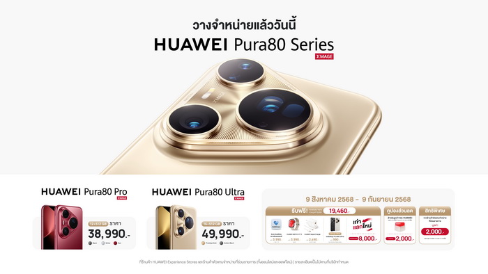 HUAWEI Pura 80 Series พร้อมให้คุณเป็นเจ้าของแล้ววันนี้ โดย HUAWEI Pura 80 Pro วางจำหน่ายใน 3 สี ได้แก่ สีดำ สีขาว และสีแดง (เป็นครั้งแรกในรุ่น Pro) ในราคาเพียง 38,990 บาท ส่วน HUAWEI Pura 80 Ultra มีให้เลือก 2 สี ได้แก่ สีทอง และสีดำ ในราคาเพียง 49,990 บาท พิเศษเมื่อซื้อระหว่างวันที่ 9 สิงหาคม – 9 กันยายน 2568 รับของสมนาคุณมูลค่ารวมสูงสุดกว่า 19,460 บาท ฟรีทันที เช่น HUAWEI Care มูลค่า 3,990 บาท HUAWEI WATCH FIT 3 มูลค่า 3,990 บาท HUAWEI SuperCharge มูลค่า 2,490 บาท และเคสมือถือรุ่น HUAWEI Pura 80 Ultra มูลค่า 990 บาท* (เฉพาะรุ่น Ultra) พร้อมโปรโมชั่นเก่าแลกใหม่ ลดเพิ่มสูงสุด 8,000 บาท ที่ HUAWEI Experience Store และร้านค้าที่ร่วมรายการทั้งออฟไลน์และออนไลน์ รวมถึง HUAWEI Store และร้านค้าอย่างเป็นทางการของหัวเว่ยบนแพลตฟอร์ม Lazada, Shopee และ TikTok Shop นอกจากนี้ยังเพิ่มความพิเศษสำหรับลูกค้า My HUAWEI รับคูปองส่วนลดมูลค่า 2,000 บาท และสิทธิพิเศษจากร้านค้าตัวแทนที่ร่วมรายการมูลค่า 2,000 บาท (เฉพาะรุ่น Pro) และผู้ใช้ HUAWEI Pura 80 Series ยังเพลิดเพลินกับสิทธิประโยชน์สุดพิเศษจากแอปพันธมิตร ได้แก่ รับบริการคลาวด์ 200GB ต่อเดือน ฟรีเดือนแรก และสมาชิก HUAWEI Video x Mango TV VIP ฟรีเดือนแรก