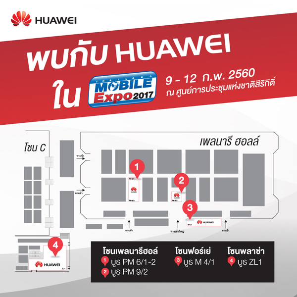 นอกจาก Huawei Pavilionแล้ว แฟนคลับหัวเว่ยทุกท่ายยังสามารถเยี่ยมชมบูธหวัเว่ยได้ทั่วทั้งงาน Thailand Mobile Expo ณ โซนเพลนารีฮอล์ บูธ PM6/1, 6/2 และบูธ PM 9/2, และ โซนฟอร์เย่ ที่บูธ M4